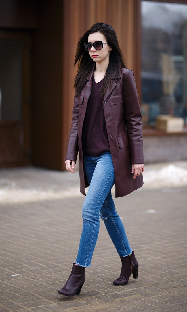 There’s one way of going with a leather coat: it’s stiff. So you might as well go for a polished look. And you don’t want it to look like a kid’s rubber rain coat so go for darker and colors.