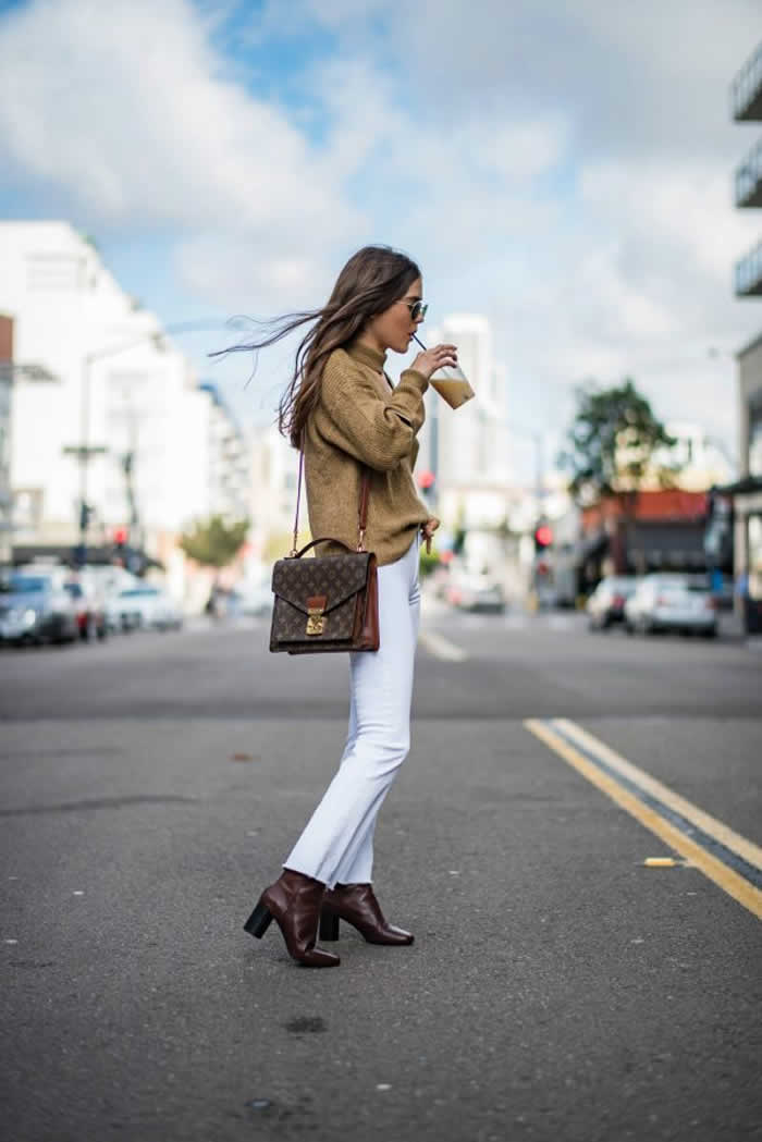 Bust the myth that white jeans are exclusively for summer, and wear a pair with a knit sweater and boots for a cool and casual fall look! We are loving the contrasting colours of Paola Alberdi’s outfit; there is no better way to wear this trend!