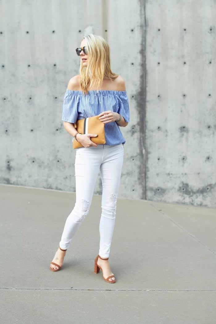 Caitlin knows that blue pinstripes go a treat with white jeans, as she pairs the two in an off the shoulder tank top, and distressed jeans. Finish this style with statement heels to complete the look.