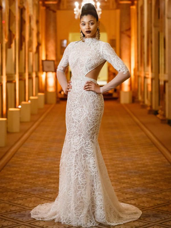 Berta Balilti presented a glamorous collection that proves quite literally that a bride deserves to shine on her wedding day. Berta’s strongest points from her hand embellished lineup included a plunging V-neck dress with 3-D lace flowers, middle slit with sparkling underlay and open back, and an illusion strapless dress with lace embroidery, open back and optional lace embroidered overskirt.