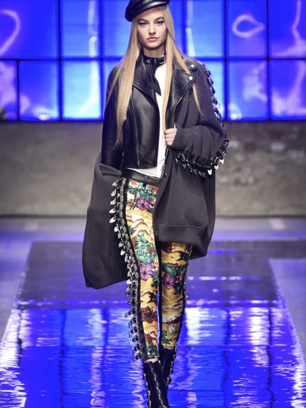 This season, the designers seemed to have lost their way. Instead of their signature playful glamour, they delivered an exercise in exaggeration. The engraved buckles of Western-style belts became the signature embellishments of the men’s and women’s lineups. For example, they ran down the legs of men’s leopard pants, trimmed the perfecto jackets and punctuated the oversized cardigans. Leather was crafted for men’s skin-tight pants and mini skirts, worn with bold tops in tropical floral prints, sometimes embellished with allover embroideries of micro crystals.