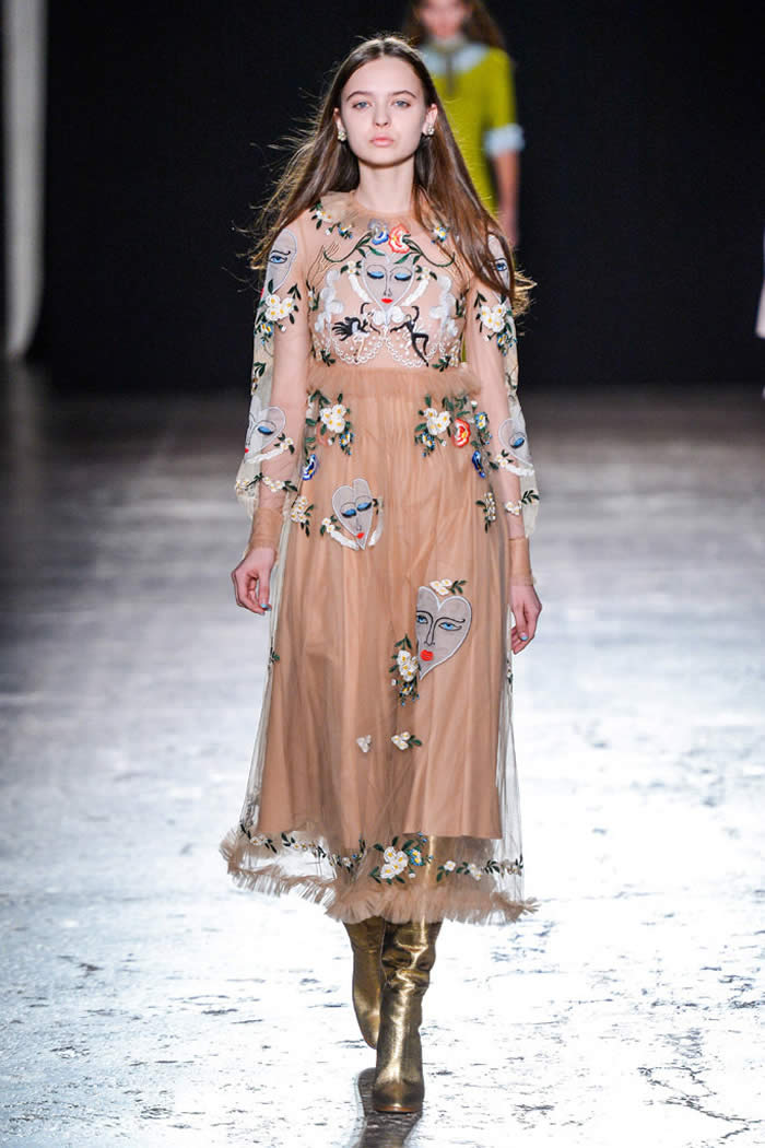 The best results came when Ponti reworked some of her signature’s elements, such as the face-shaped embroideries which this season got an Art Deco-inspired makeover. They appeared on a range of pieces, including a long dress with see-through inserts. More day options included tops matched with high-waisted skirts for a Seventies look, as well as military coats, which contrasted with the ultra sweet mood.