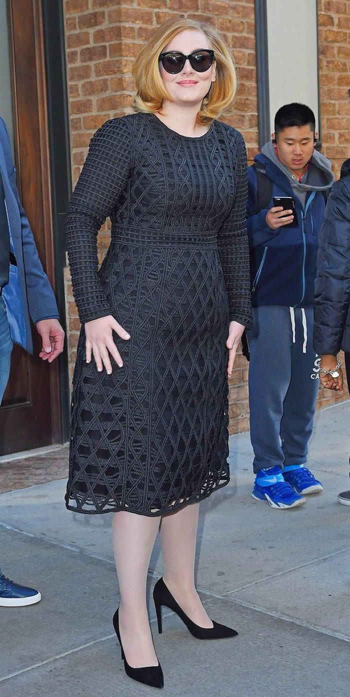 Adele ditches the jumpers and floaty kaftans for a structured black frock and heels on promo duties in New York. We like this smart new look.