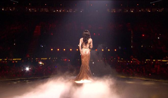 The singer, who sported a full beard, smouldered like a Bond Girl in a gold embellished fishtail gown. Walking onto the stage in front of a smokey backdrop, she gave a powerful performance of her song Rise Like a Phoenix. The look was set off by diamond earrings, while she also wore a red lipstick, wore her long hair in waves and defined her eyes in heavy black eyeliner.