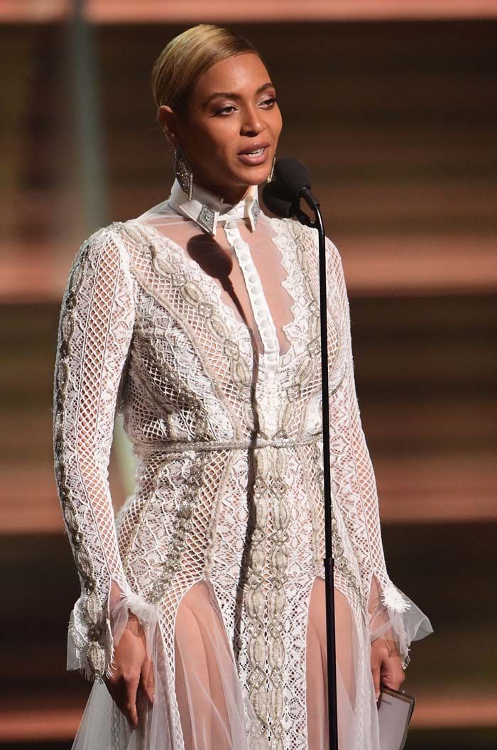 Beyoncé stepped out onstage to present the final award of the night, Record of the Year, wearing a daring, long sleeve, white, lace, semi-sheer gown with glittering embellishments, a high button-down collar and two thigh-high slits. She paired the look with metallic sandals and large, glittering, diamond-shaped earrings.