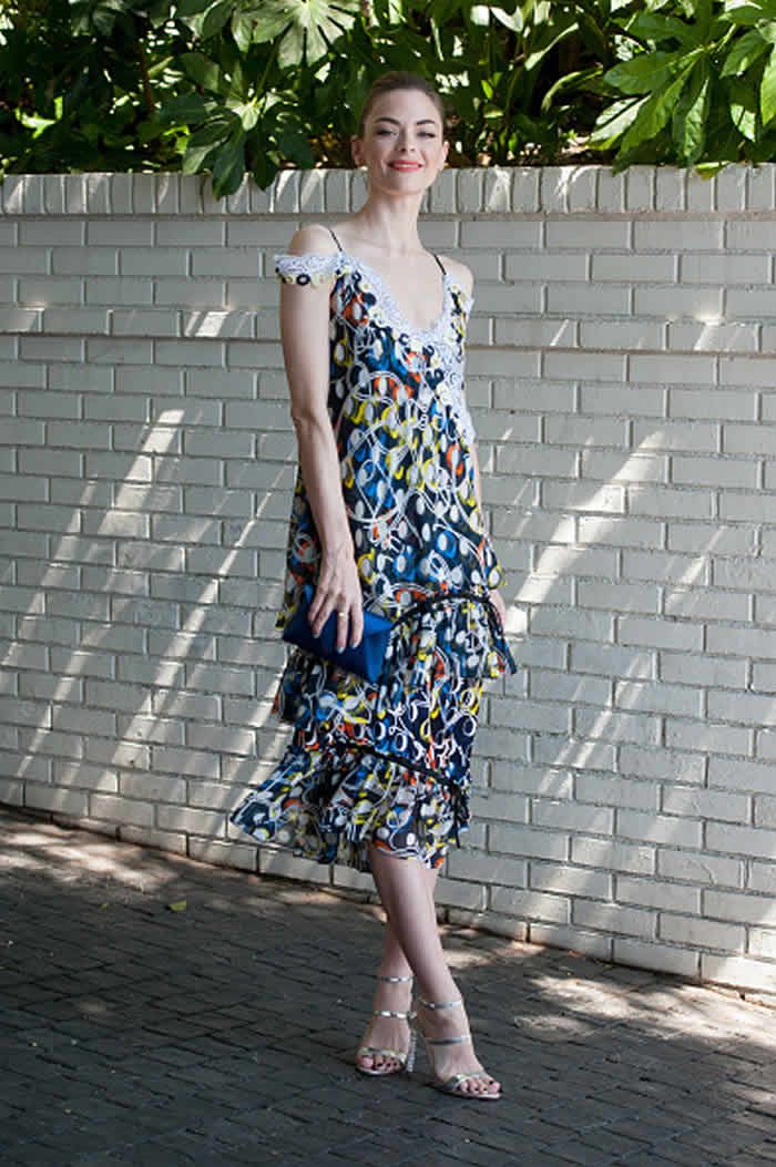 Jaime King was photographed with a Tyler Alexandra clutch while celebrating the Jaime King x ColourPop Launch ALCHEMY at Chateau Marmont yesterday afternoon in Los Angeles. The actress was Spring chic in her printed dress and Tyler Alexandra Lee satin clutch in Navy.