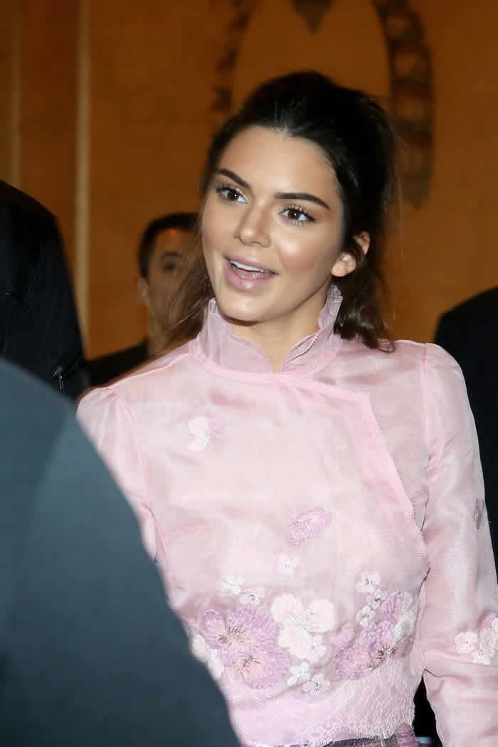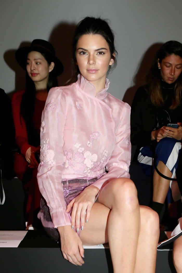 Kendall Jenner, 19, managed to be the center of attention at a fashion show during Paris Fashion Week and she’s not even walking down the catwalk! The 19-year-old went braless and revealed her nipples in a pink blouse at the Shiatzy Chen show on Oct. 6.