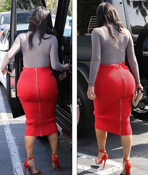 Completing her look with a pair of matching red and grey strappy heels, Kim showcased her famously curvy derriere as she left her vehicle and arrived at her family’s office in LA.