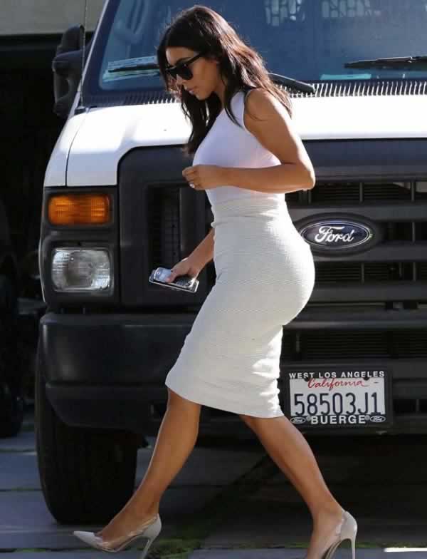 Kim was showing off her fantastic hourglass figure in a cream knit pencil skirt, which clung to her famous bottom. The 33-year-old also wore a tight white tank top tucked into the skirt, and gave her petite frame a boost with dove grey pumps that had see-through plastic sides.