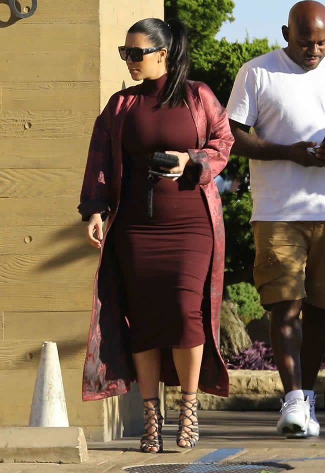 Pregnant Kim Kardashian’s bump was clearly evident on a lunch date with rapper hubby Kanye West. The 34-year-old star, thought to be four months gone, wore a burgundy maternity dress with halter neck. Curvy hips swinging, the mum-of-one also wore a long pink Kim-ono jacket and lace-up heels.