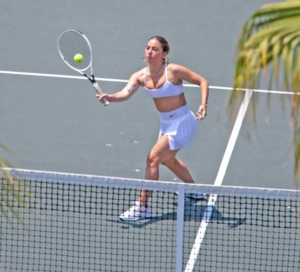 The star was seen focusing greatly on her game as she played alongside her tennis instructor.