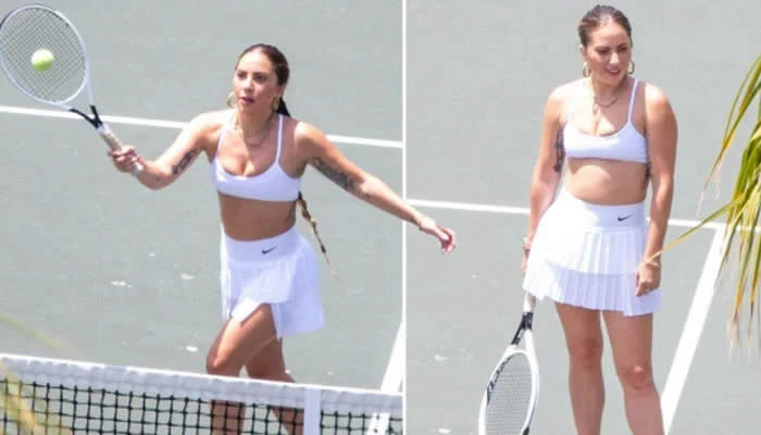Gaga was snapped by paparazzi holding a tennis racket as she donned a Nike outfit for the day.