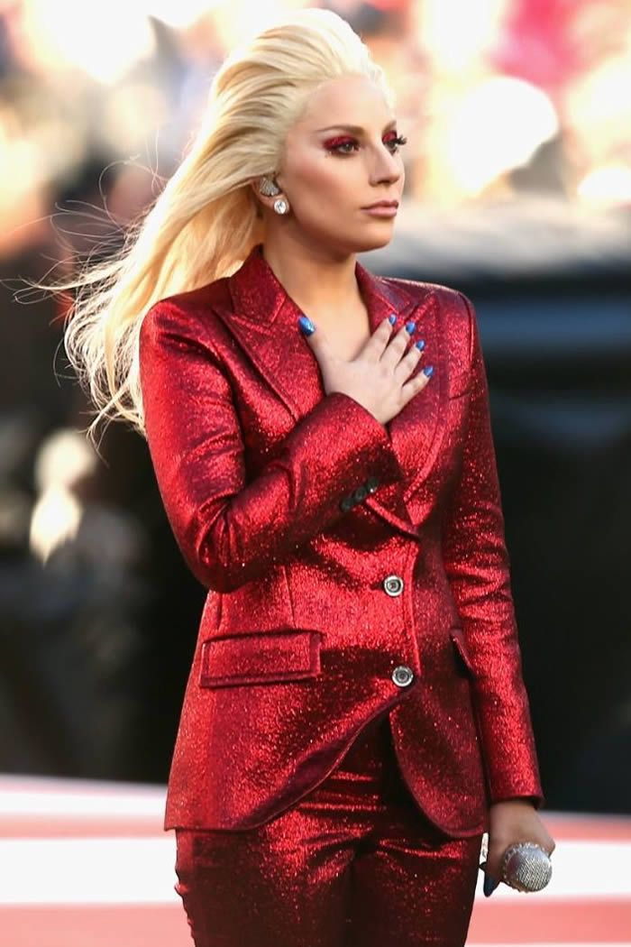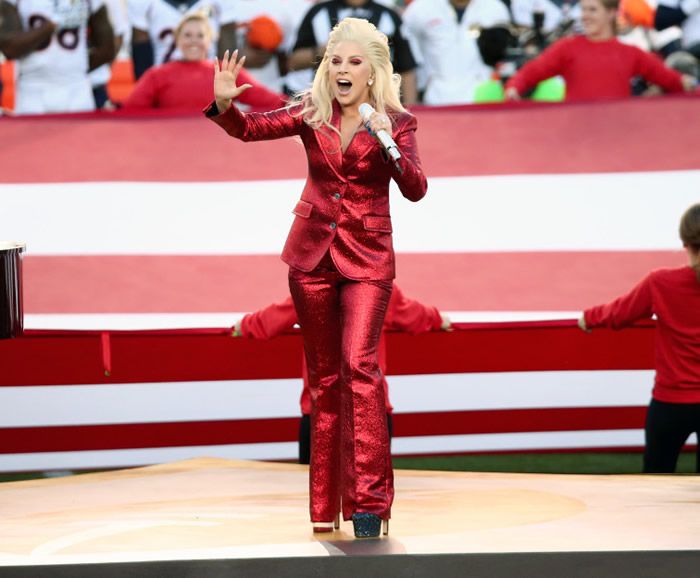Lady Gaga presumably had the choice of almost every designer our there for the outfit she would wear to sing “The Star-Spangled Banner” at the opening of the 50th Super Bowl on Sunday. But for her appearance at the 50 yard line of Levi Stadium in Santa Clara, Calif., she went Italian and asked Gucci creative director Alessandro Michele to whip something up. Michele created a custom hibiscus red Lurex two-button peak lapel suit with flared pants. His input also extended to accessories: Gaga wore Gucci platform heels with a brass cat head and spike details. She added sparkle eye makeup and blue nail polish.