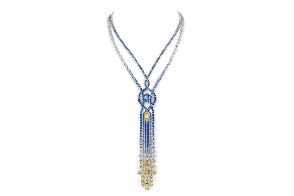 Divided into sections inspired by China, India, Japan, Russia and Iran, it features extraordinary stones including an 188.79-carat Mughal emerald that formerly belonged to a maharaja now the centerpiece of the Fleur des Indes necklace and a cabochon sapphire that was once the property of Iran’s Imperial family, set into a ring dubbed Trésor de Perse.