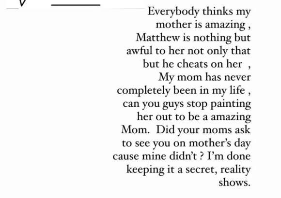 The former Playboy model’s response comes hours after Alabama, 15, took to her Instagram Story with several allegations. “Everybody thinks my mother is amazing,” Alabama wrote. “Matthew is nothing but awful to her. Not only that, but he cheats on her. My mom has never completely been in my life. Can you guys stop painting her out to be an amazing mom? Did your moms ask to see you on Mother’s Day [because] mine didn’t? I’m done keeping it a secret, reality shows.”