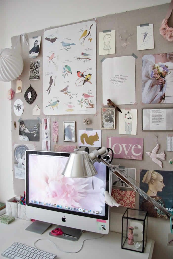 Not all clutter is rubbish, and sometimes you might not want to throw out all those inspiring magazine pages or images. So why not make a feature out of them? Creating a pin board or mural out of items like these is an increasingly popular trend, you can even pin important notes up there too to free up more desk space. In addition, go for tall bookcases, recessed shelving or floating shelves rather than wide storage to utilise an empty wall without taking up valuable floor space.