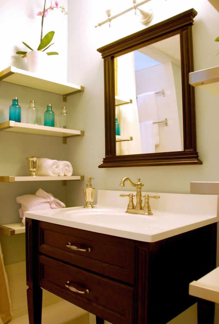 Narrow wall shelves are an excellent way to store bathroom essentials in a stylish way. Invest in attractive canisters to hold cotton swabs, cotton balls and your favorite lotion, and place unsightly toiletries under the vanity. Small wicker baskets can also be placed on the shelves for additional, hidden storage. Design by John Gidding.