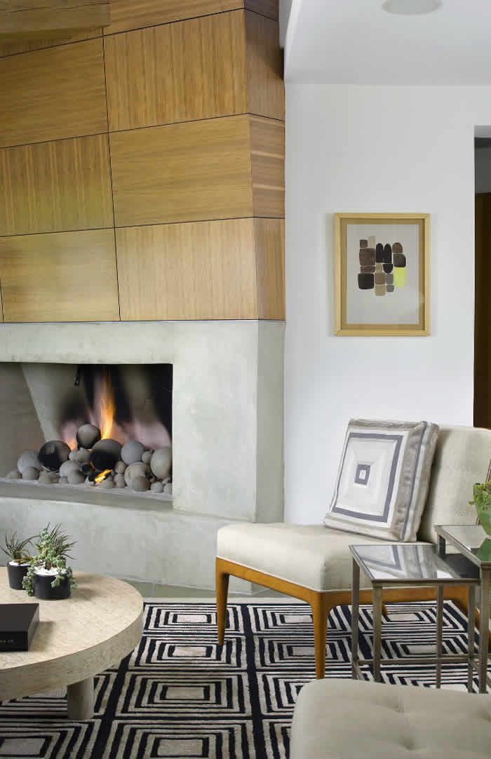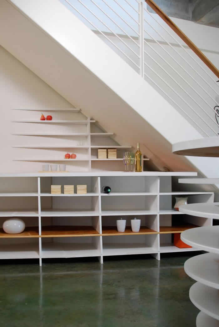 Any space can be enhanced with additional (and stylish) storage solutions. Designer John Gidding added a shelving unit directly below the stairs to take advantage of the awkward, extra space. Located adjacent to the kitchen, he turned the unit into a mini bar, storing bar essentials and other accessories. These shelves would also be an ideal place to display an abundant book collection.