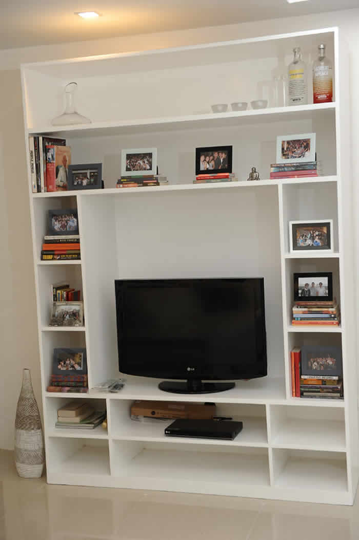 To make your space appear larger, avoid using dark hues. This eclectic living room features a gray focal wall for a punch of color but keeps the rest of the space light and open with crisp, white furniture and white built-in units.