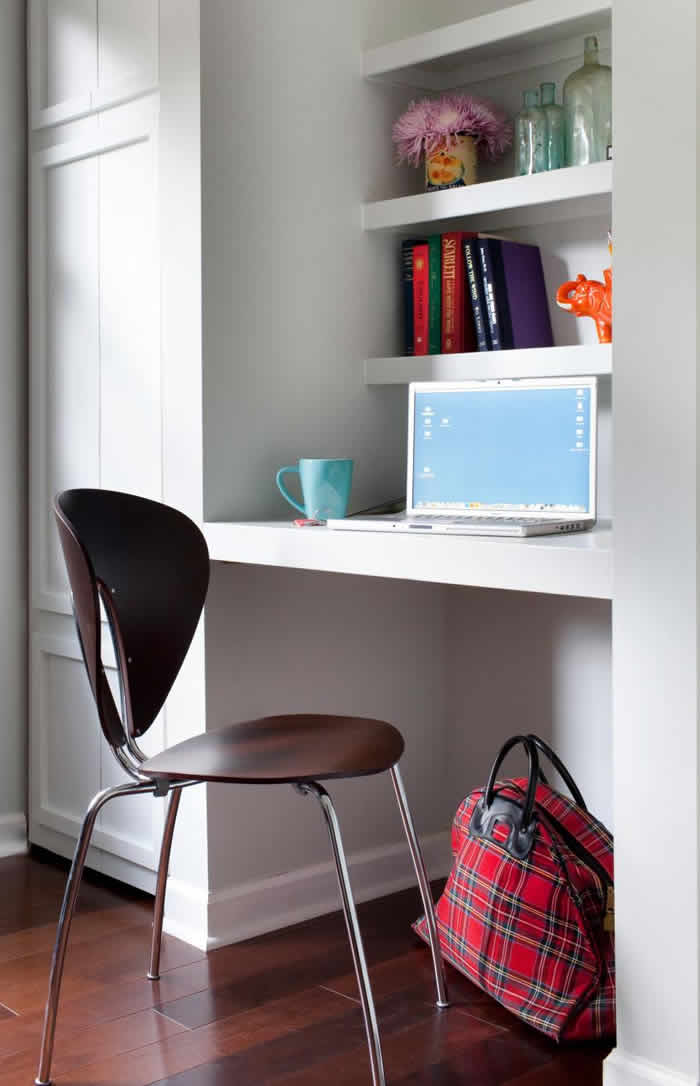 When dealing with a small bedroom, don’t let any extra space go unused. Designer Brian Patrick Flynn turned this nook between two small closets into a simple and efficient workstation. Adding shelves above the desk provides extra space to display and store books. Because the desk is built into the wall, it takes up little room and still leaves an open path in the bedroom.