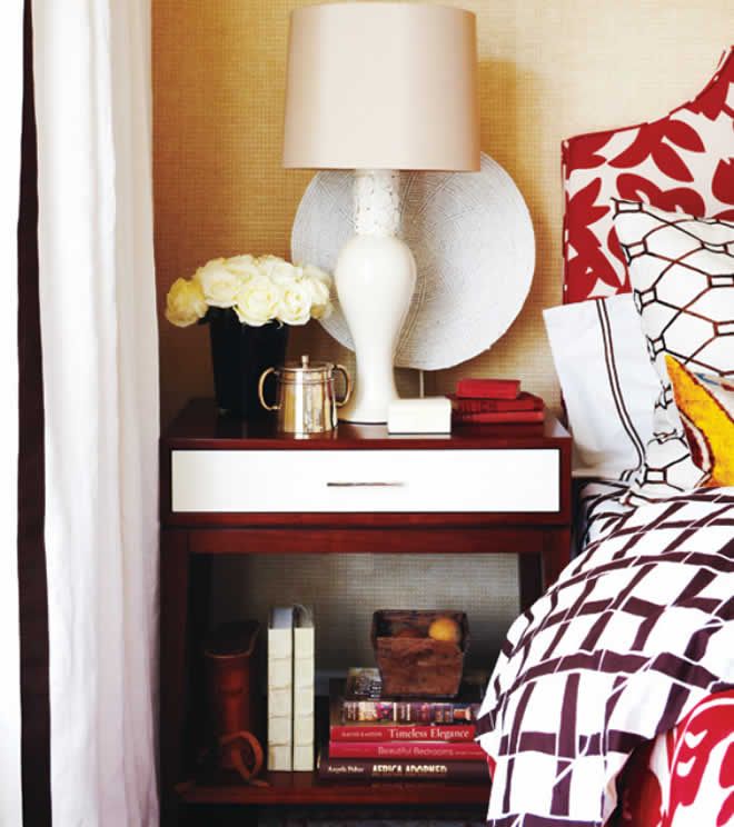 A traditional lamp is a shapely addition to any bedside arrangement, but a funky light fixture can add a little extra design flair, especially when combined with fabulous art and a collection of favorite items.