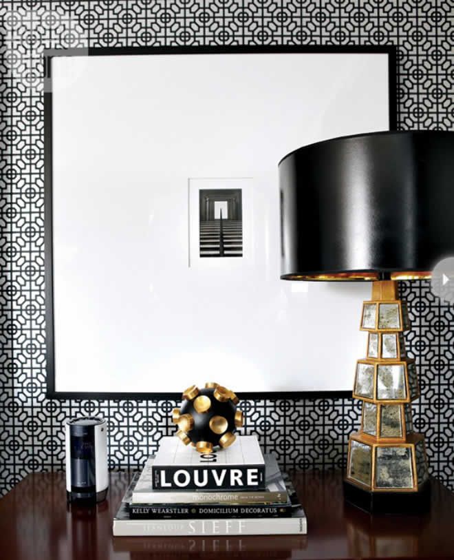 Use objects that vary in height and size to create a balanced focal point. Here, a curvy lamp balances a modern, boxy table while the sculpture adds visual interest.