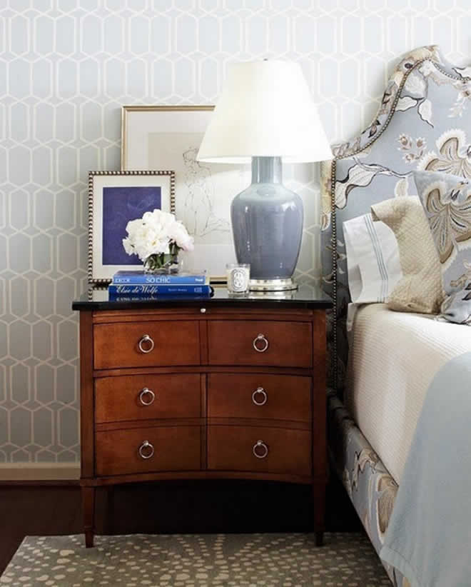 Color is key when decorating the nightstand. Make sure all the items are in the same color family and coordinate with the bedding, yet are still interesting on their own, like this beautiful blue room contrasted with a vintage wooden dresser.