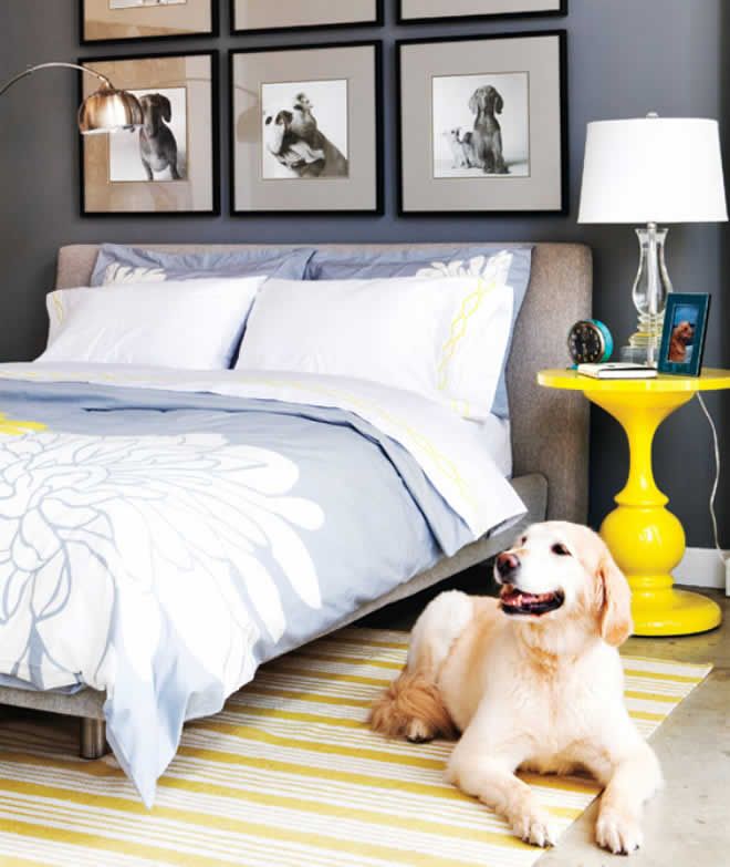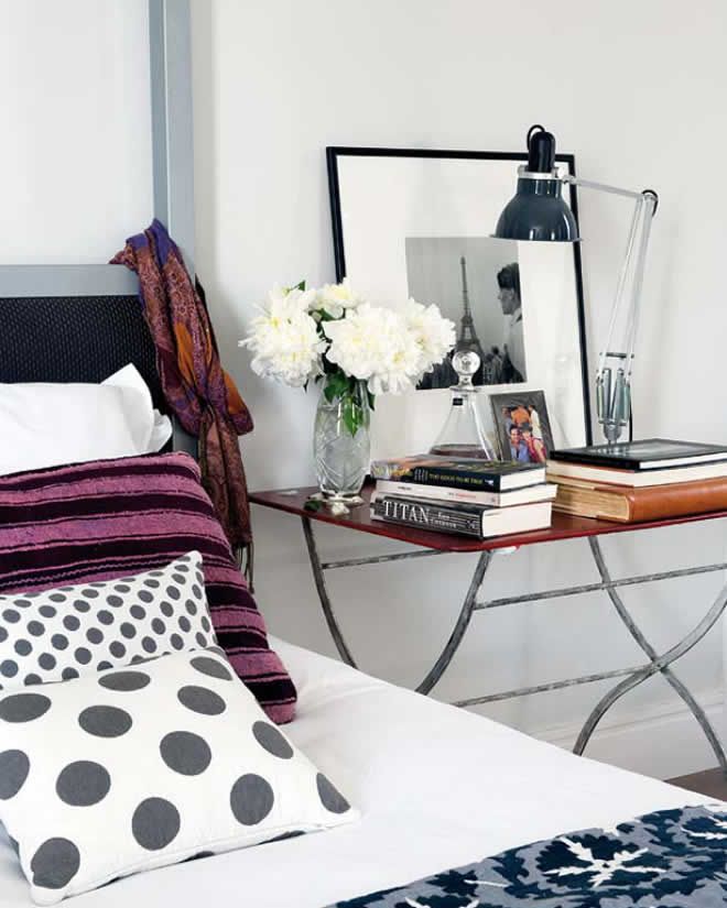 The guy’s side of the bed doesn’t have to be boring and empty. A pile of books on the table can act as a shelf to display a travel memento or cool alarm clock.
