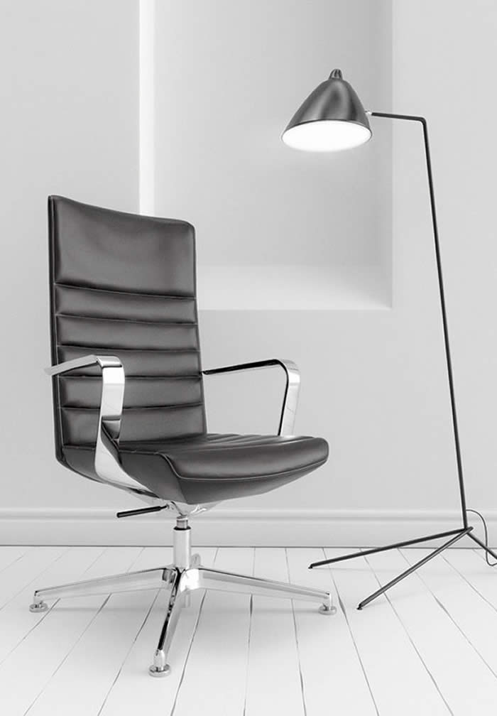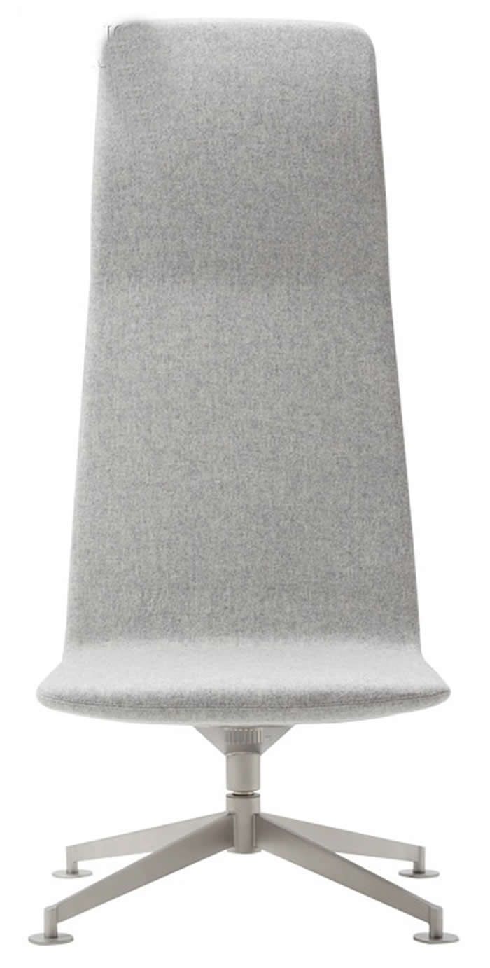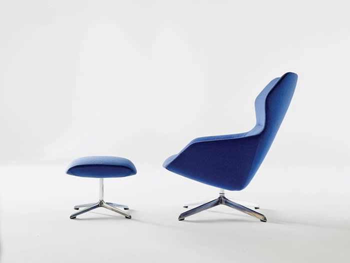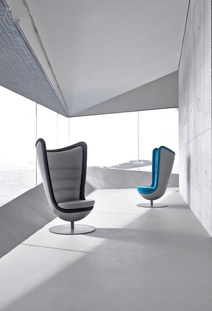 ItemDesignwork’s Badminton lounge chairs with rigid polyurethane shells, leather or COM upholstery, and 360-degree auto-return steel swivel bases finished in electrostatic epoxy polyester by Actiu.