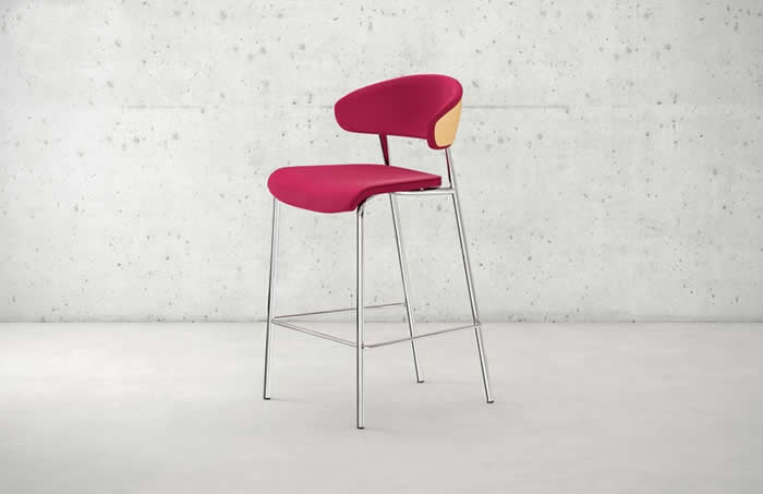 Bistro barstool with upholstered seat and backrest, 3-D-molded veneer back, and polished chrome base by Loewenstein.