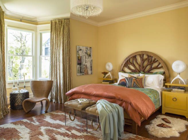 DRAMA! – Even the brightest, most cheerful bedrooms need an element of dark, sexy glamour. This bedroom by Windsor Decorating and Design has them in spades: The moody wall paint, the theatrical chandelier, even an oversized gray headboard does the trick. But notice how clean lines and touches of white keep it from looking like a bordello: That balance is key. Stick with one or two pieces and you’ll be golden.