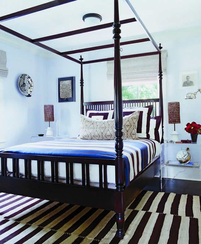 A THEME – It’s the first thing a child will consider when putting together their first bedroom, but adults tend to shy away from a decorative theme when envisioning their bedroom. But even when it’s not Spiderman or Princess powered, a theme can be not just a unifying device, but a calming one. In this Southhampton cottage bedroom designed by Timothy Whealon, stripes are used throughout (even in the motif of the 4 poster bed!) to create a streamlined yet funky touch. Notice how they’re not all the same width, color, or even direction: That’s what keeps it from looking like a bed in a bag.