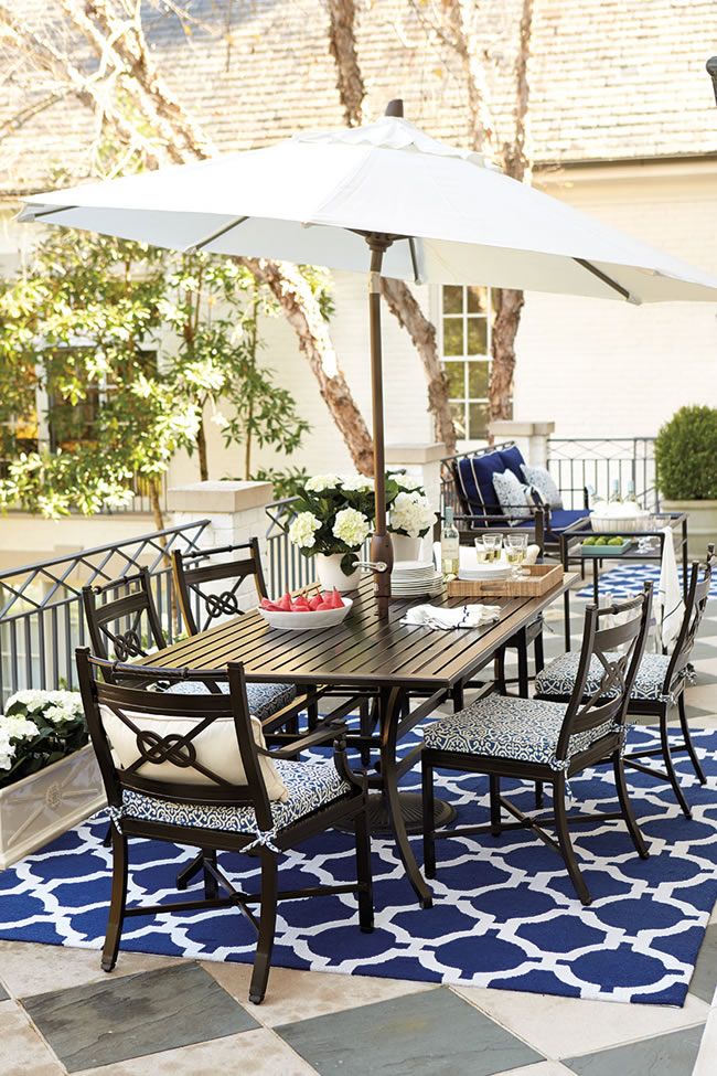On a rug, a pair of throw pillows or an outdoor umbrella, classic sailor stripes will play up the relaxed, beachy vibe in any space. And because stripes are the neutral of the pattern world, you can layer on more prints and color to your heart’s content.