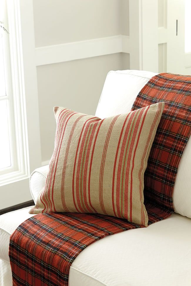 Red plaid is a forever classic. But if it feels too stuffy for you, pair it with a crisp stripe for a fresh update. The combination is just the right dose to make a room pop, especially when you counter the weight of the patterns with a solid, such as our pure white sofa.