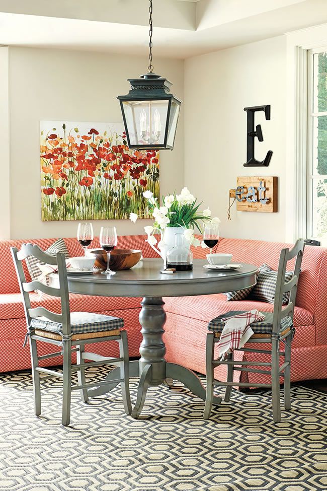 If you find red to be a little too intense, compromise with coral, and pair it with gray to temper the hue. The chic lattice pattern of our Merrick Coral Fabric by the Yard covers the banquet, bringing warmth and zest to this cozy nook without overwhelming the space. The graphic rug is a great equalizer while the poppy print repeats the coral color for balance.