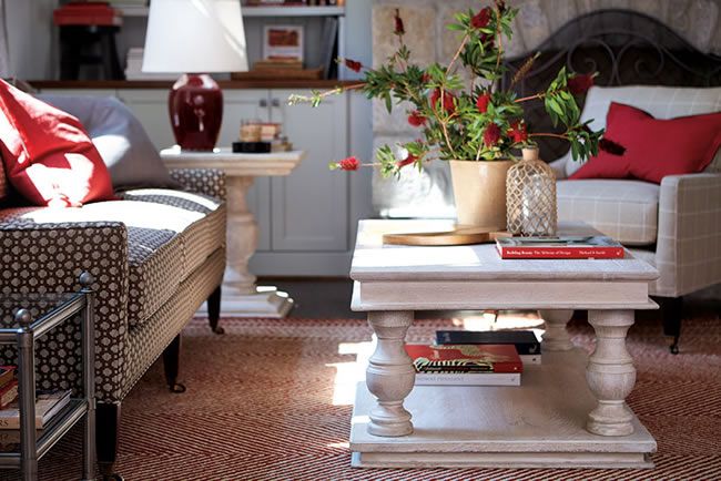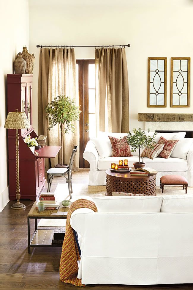 White walls and furnishings, high ceilings and natural light put a welcome focus on colorful pieces. The San Marino Secretary in Chianti Red makes a striking addition to this living room, as does the red upholstered footstool and complementary throw pillows.