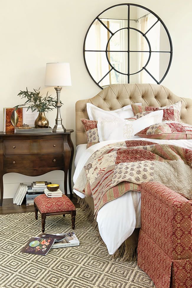 Because red is energizing, it’s not a color that’s typically associated with the bedroom. But as long as it’s used sparingly and in combination with neutrals and dark wood tones, it can be the just the right amount to reinvigorate a tired bedroom. The mix of patterns in the patchwork quilt and upholstered bench works here, because the rust red hue unites the two.