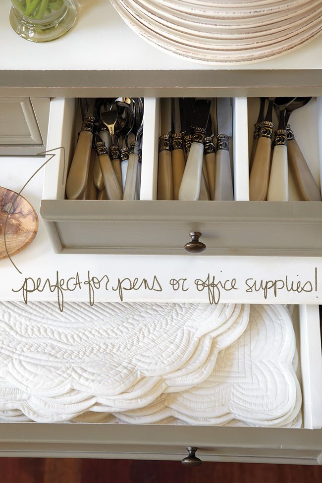 In the same way that the dining room above uses a bookcase in unconventional ways, our Paulette Server is deliciously versatile too! While it’s normally packed with stacks of plates, serving pieces, and glassware in our catalog, this time, we decided to show it in a different room — the office! With half closed and half open storage, our Paulette Server is a great solution for storing unsightly necessities in a hardworking home office. Organize the narrow, divided drawers we normally use for silverware with pens or small office supplies like tape, scissors, or paper clips.