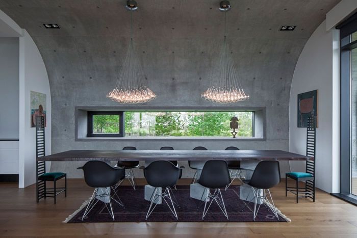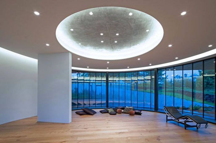 The main building/structural materials are concrete, steel and glass, straight walls and curved. The main “visual” claddings/ materials used throughout the building, inside and outside are metal cladding, (Titanium), exposed concrete, glass and also a tile used in fine detailing around windows etc. On the outside the concrete curves are wrapped into Titanium, ever lasting metal shell, but inside in selected areas such as living room and master bedroom, the concrete curves are exposed and visible, making a contrast with other walls inside that are soft and white. In selected areas inside “the graffiti” in the tiles becomes visible. The unusual effects in the tiles are created with painted steel and metal oxidation effects, that is inspired by Banksy, the graffiti artist. The house is a foreign/alien, an object thrown into the site, beautiful nature, making a strong a contrast between man made object and somewhat untouched nature.