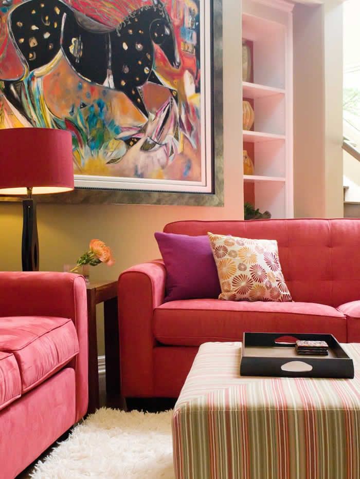 The best way to furnish a living room with a red sofa depends on your decorating style. A red sofa is ideal for a contemporary living room, and the look works best when you mix it with neutrals. For other large surfaces such as walls, window treatments, floors and furniture stick with white, black and white, or a monochromatic range of colors in shades of gray or brown. For a cozy cottage look, combine a red sofa with upholstered chairs, throw pillows and window treatments in a mix of fabric prints. Floral chintz, ticking stripes, checks, plaids and feminine mini-prints are all charming options.