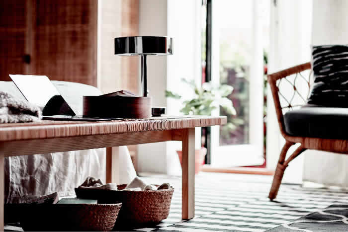 Coffee Table, Armchair, Cushion, Tray, and Table Lamp