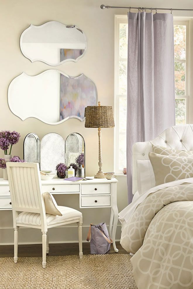 To echo the softness of Spring, we infused this bedroom with planes of lavender, balanced with neutral patterns. We chose our Demere Stripe in Natural, Suzanne Kasler’s Signature Linen in Lavender, our Hayland Natural Fabric, as well as our Emerson Stripe fabric in Lavender. To give the space a more relaxed feel, we brought in little hints of nature, like with our Dareau Woven Lampshade, a bench with a woven seat, and a natural fiber rug.