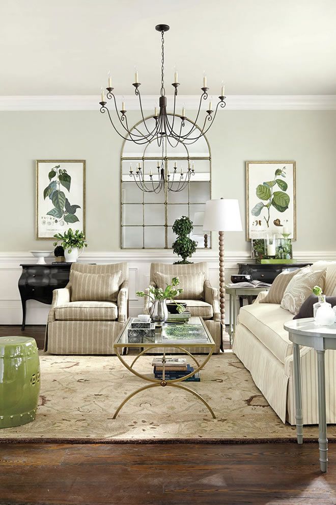 Accents of green give this living room a fresh-for-Spring look. We started with a neutral palette, like our Demere Stripe in Flax, our Trilby Basketweave in Natural, and our Vintage Ticking Stripe in Sandalwood, but of course had to bring in a little color with our Matisse Ikat fabric! Accessories are fantastic way to give any room a certain vibe, and for that garden-inspired look, we used a preserved boxwood topiary, a garden seat in a bright hue, and pillows and art with botanical motifs.