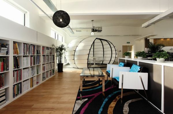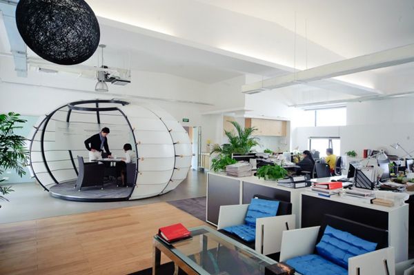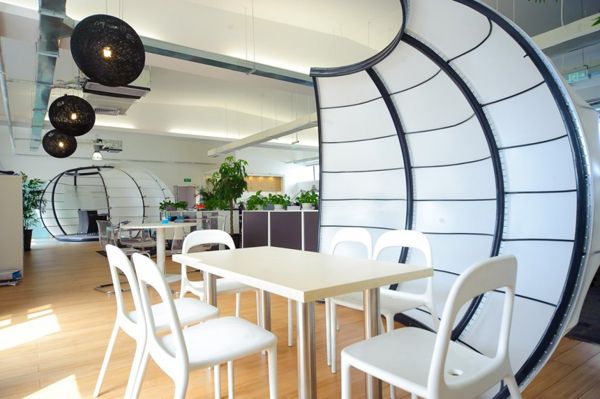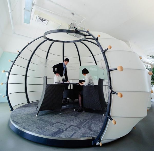 David Ho of edg Creatives designed a pumpkin shaped brainstorming room and matching partition walls for their office in Beijing, China. “Polycarbonate panels with transparent sections are used to bring the activity and energy of the two first floor meeting rooms into view.