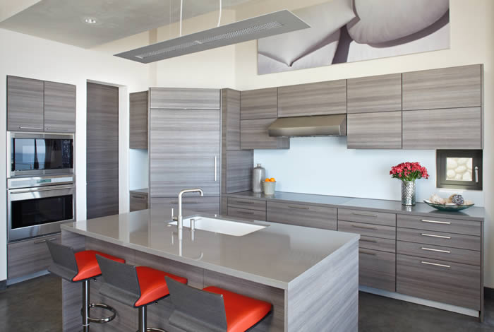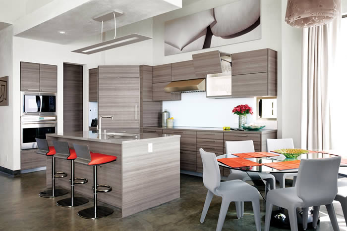 Hot orange accents bring vibrancy to a neutral gray and white backdrop in the open plan living area that features a lounge, kitchen and dining area.