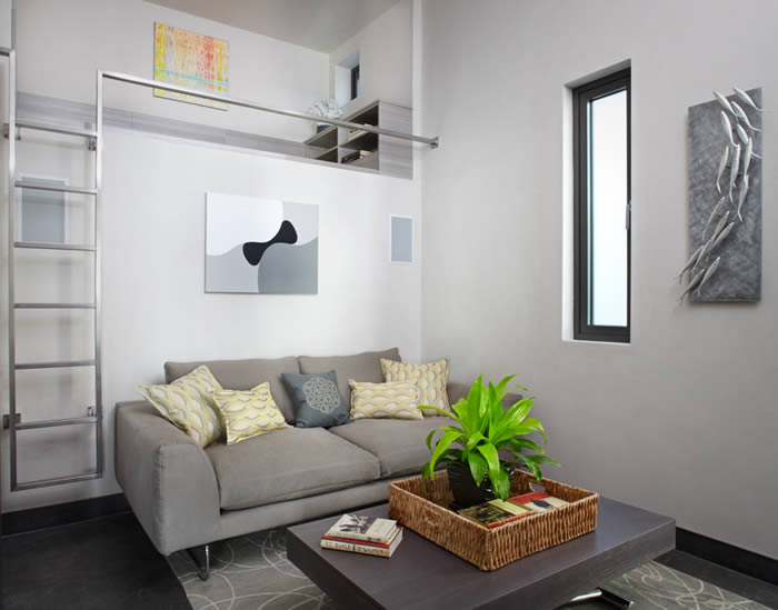 An ingenious drop down bed, which incorporates a wall display shelf, transforms a sofa space into a guest sleep space with ease.