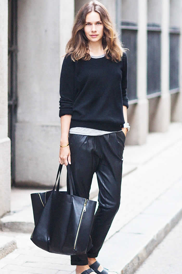 #2- Flat sandals with baggy wet look harem bottoms are a great combination for a cool, casual outfit look. Who says an all black outfit doesn’t work?