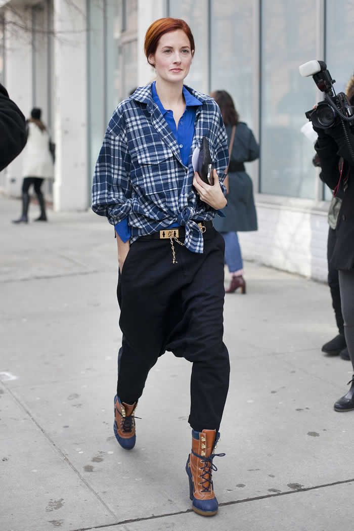 #10- Great look with baggy harem trousers and stunning blue and brown lace-up ankle booties. Add layers to this combo with a tartan shirt over denim. I love to dashing red hair with this outfit!Try to have matching makeup and cute nail design for complete look.