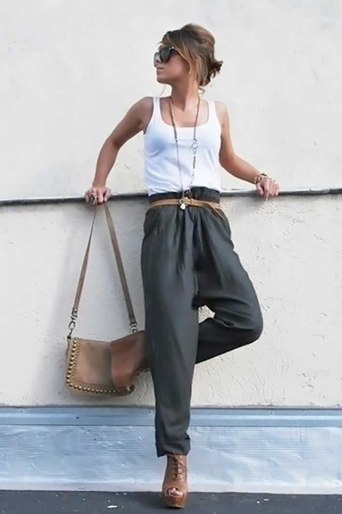 #6- High waisted baggy trousers with white tank top. This outfit look amazing with contrasting brown belt, brown bag and brown leather, peep toe wedges. great for summer.This is quite funky look you can always try different color hairstyles for a change for e g purple hairstyles are quite in these days.