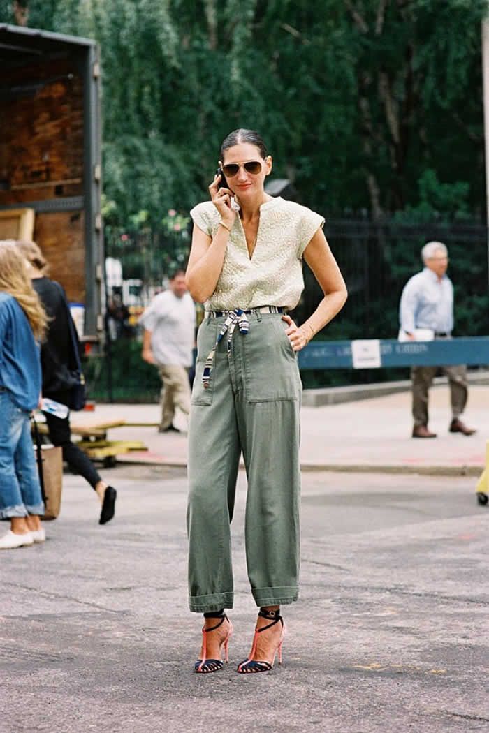 #7- Baggy olive loose fit linen trousers matched with cream deep V-neck top and contrasted with beautiful blue ankle strap pumps.One thing interested about these pants is they are easy to alter so DIY Fashion lover can easily manipulate them.